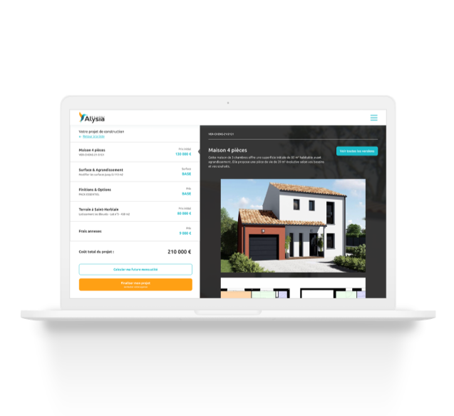 Le configurateur du site Maisons Alysia permet de combiner automatiquement une maison avec un terrain, un terrain avec une maison… tout en affichant instantanément le prix total du projet en ligne. L’interface est simple et intuitive, et le configurateur intègre sur une seule page toutes les fonctionnalités nécessaires à la constitution de votre projet.